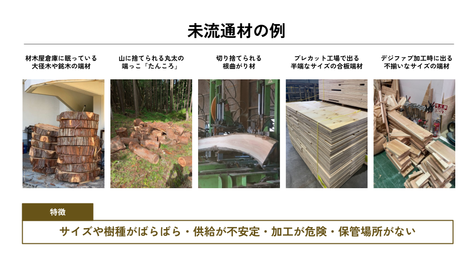 ・これまで廃棄されてきた材木の流通を可能にすることで廃棄される木材量を減らし、循環型社会に貢献する