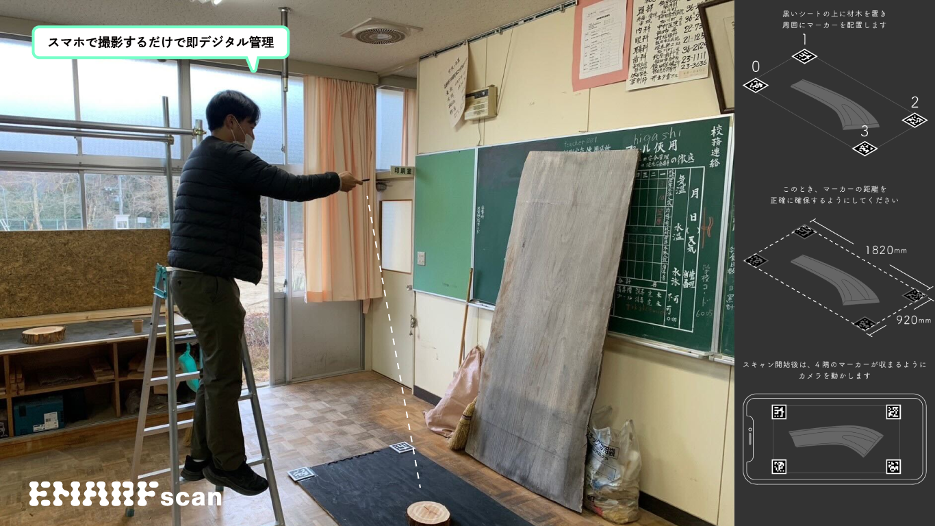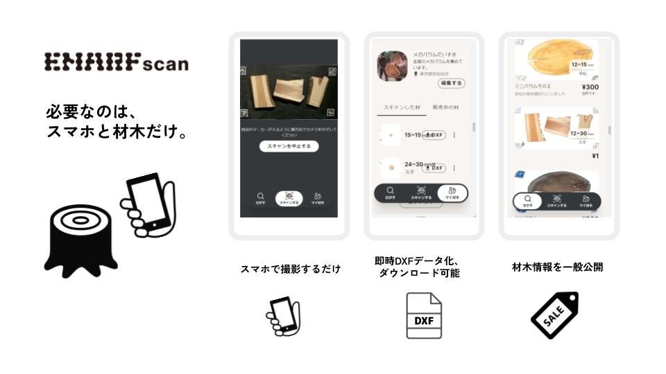 「EMARF scan」は、スマートフォンで撮影するだけで木材を即時にDXFデータに変換し、同サービス上で材木の一元管理・販売*(1)を可能にするサービスです。