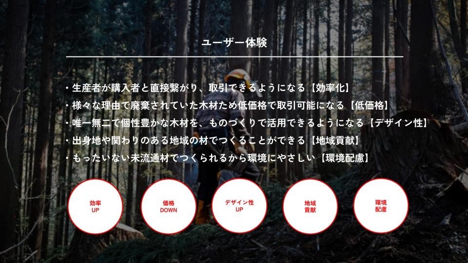 ・一般的な流通プロセスを省き生産者が購入者と直接繋がることができるようになることで、材木の低価格化を実現