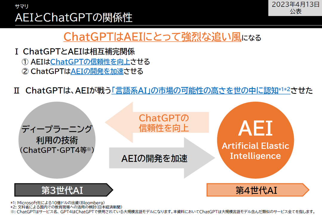 「ChatGPT」はAEIにとって強烈な追い風になるとともに、両者が相互補完関係となることを示しております。「ChatGPT」との関係性を踏まえた、AEIの目指す姿について改めて説明しております。