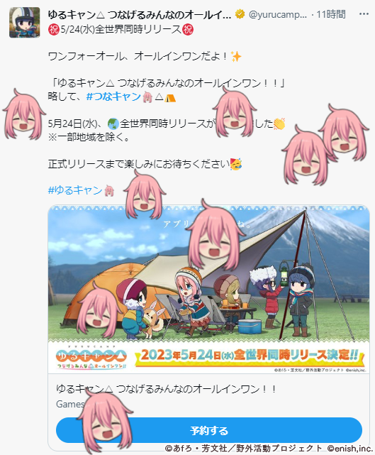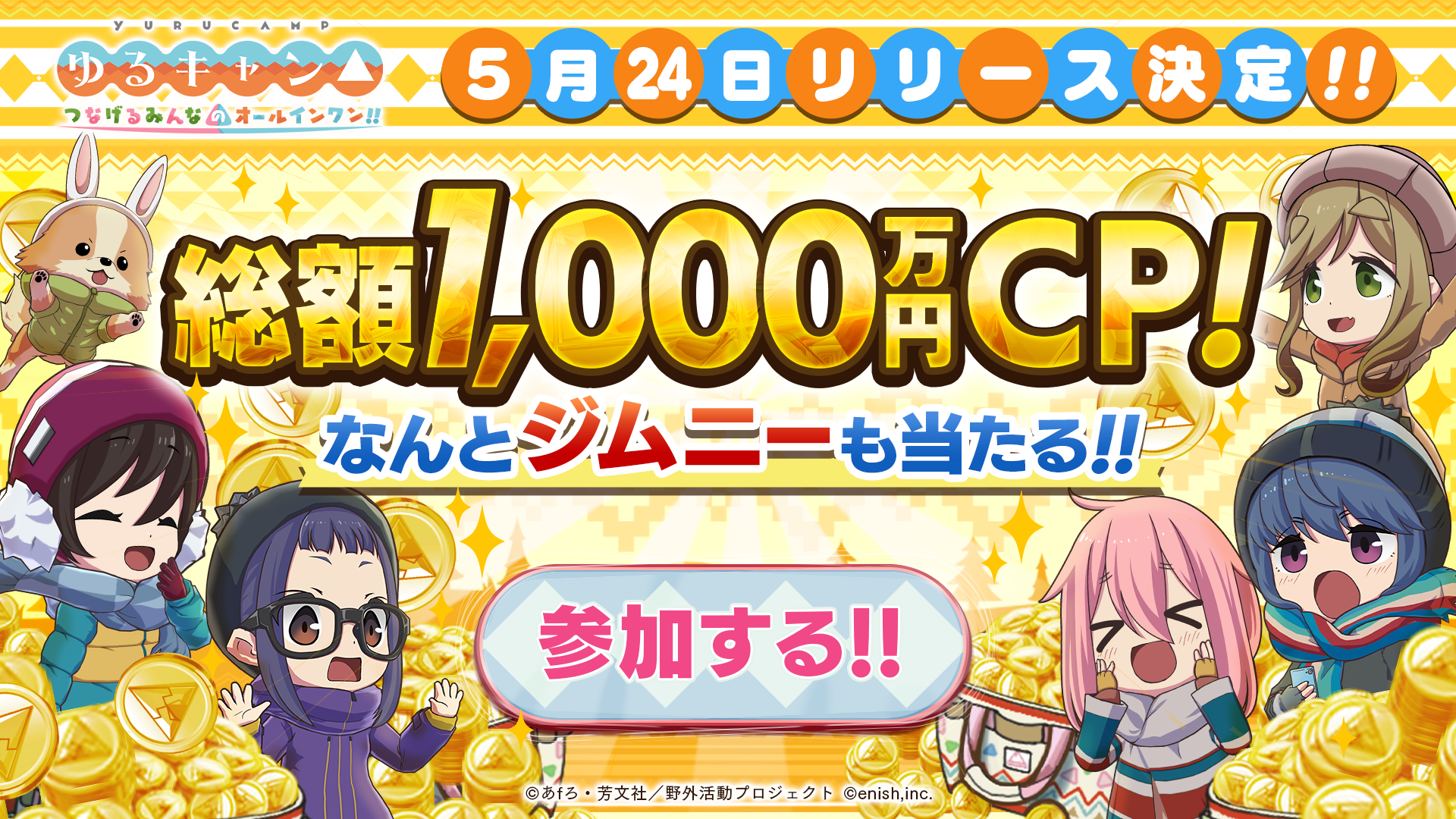 「ゆるキャン△ つなげるみんなのオールインワン!!」の全世界同時リリースが2023年5月24日(水)に決定いたしました。サービス開始までもう少々お待ちください。