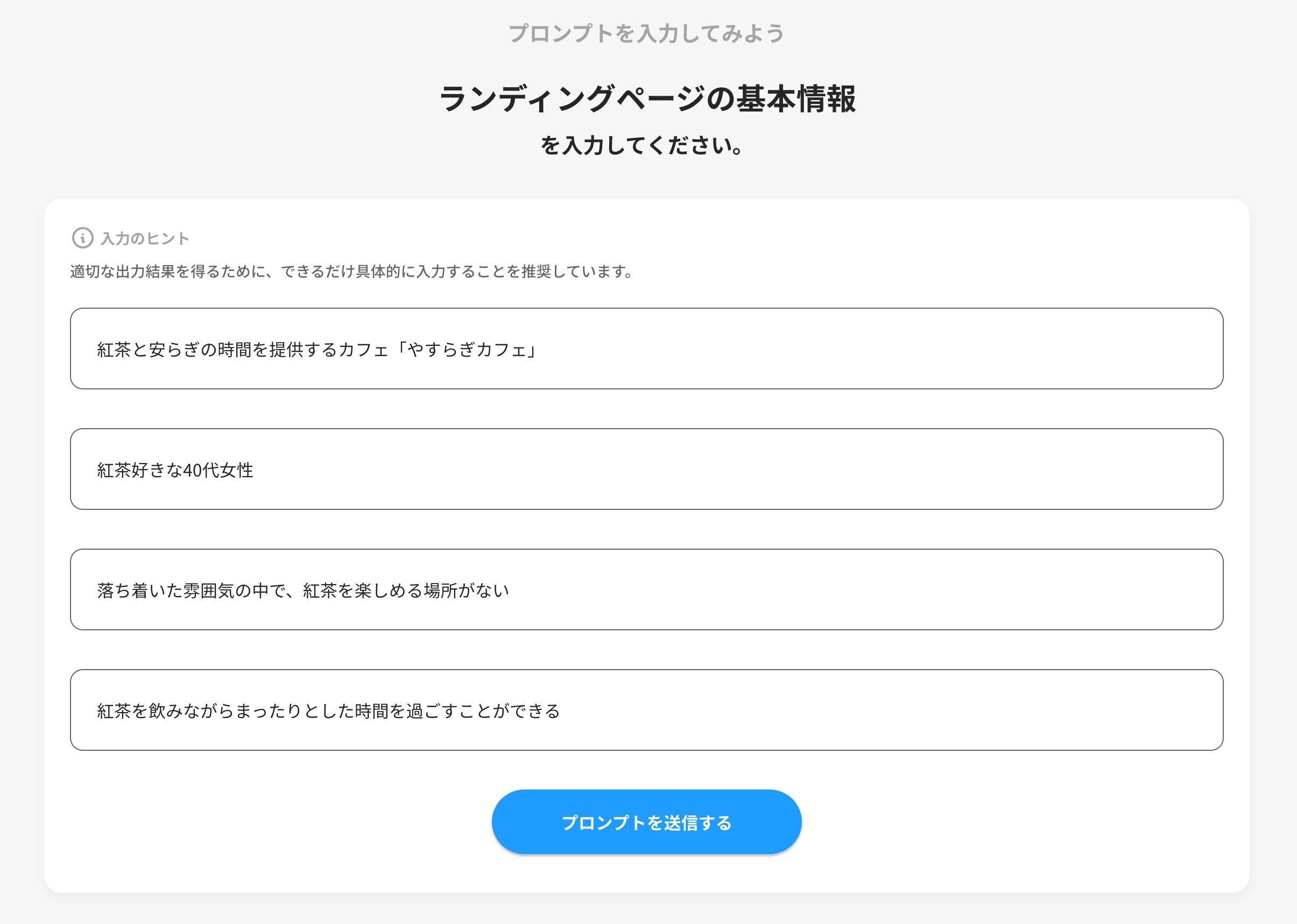 例えば、LP(ランディングページ)の構成をAIに提案してもらいたい場合、