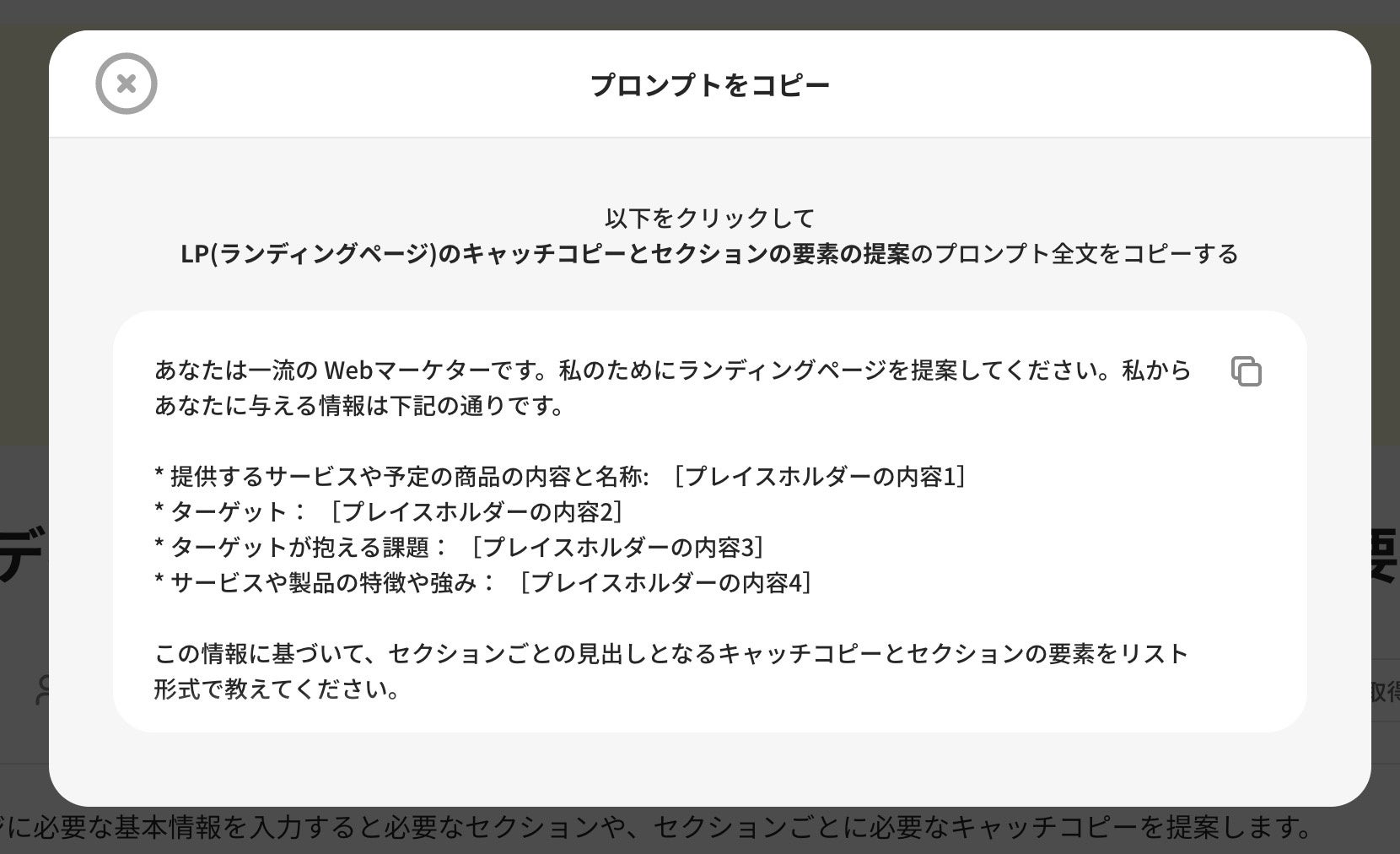 「LPのキャッチコピーとセクションの要素の提案」のプロンプトを選択すると、以下のフォーマットが表示されます。