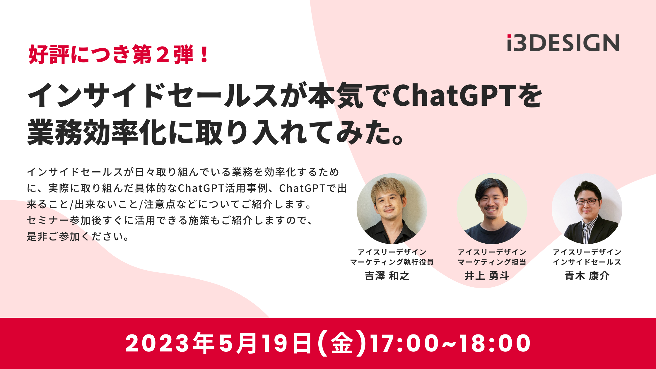 本セミナーでは、インサイドセールスが日々取り組んでいる業務を効率化するために、実際に取り組んだ具体的なChatGPT活用事例、ChatGPTで出来ること/出来ないこと/注意点などについてご紹介します。セミナー参加後すぐに活用できる施策もご紹介しますので、是非ご参加ください。