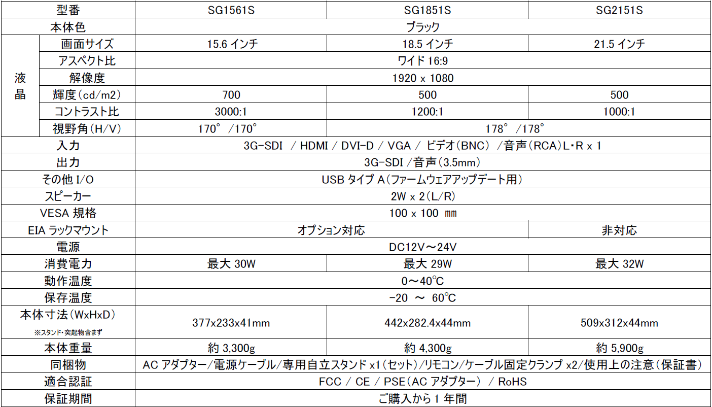 本製品はフルHD液晶パネルを採用し、3G-SDI・HDMI・DVI-D・VGA・コンポジットビデオ(BNC)入力端子を搭載した業務用ディスプレイです。SG1560S、SG1850S、SG2150Sの後継機種で、従来の構造設計をゼロベースから再構築することで、ご好評だった各種機能や仕様、そして高いコストパフォーマンス性を維持したまま、品質や使用感を大きく向上させました。