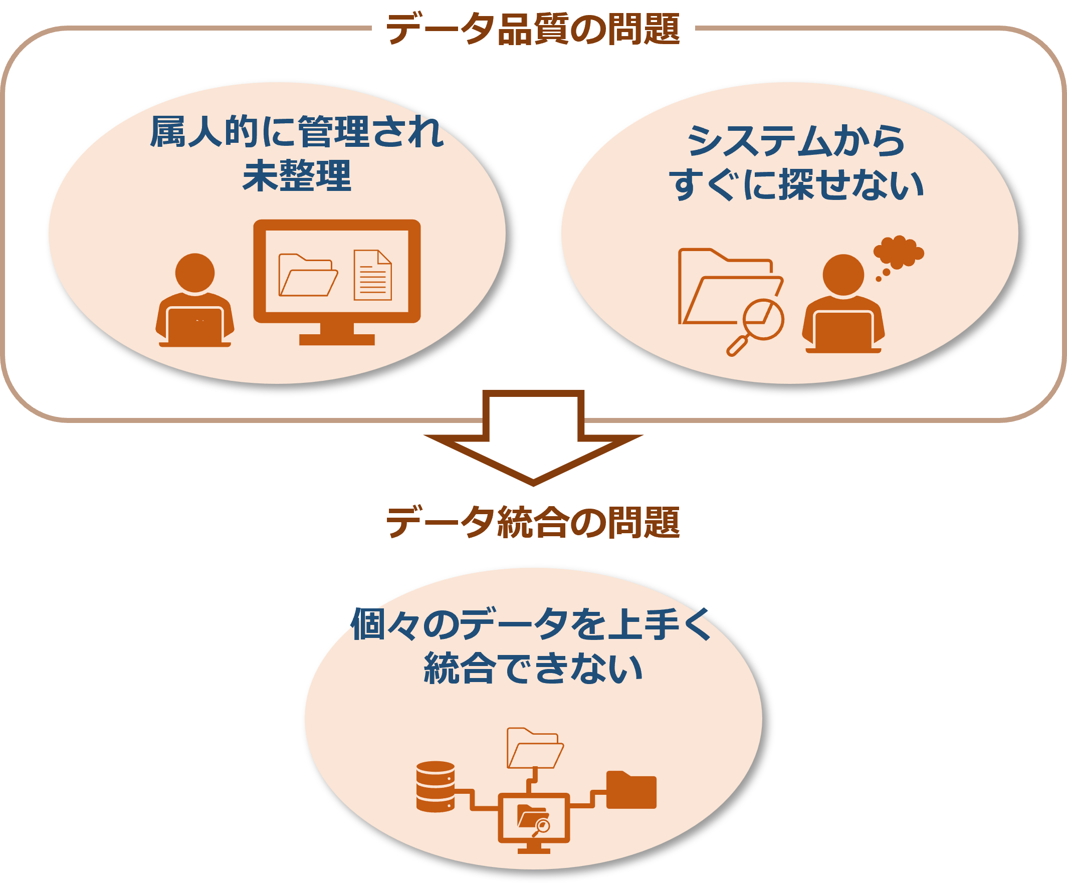 DWHなどが導入されていても異なるシステム間のデータを横断的に利用することを想定したデータ構造になっておらず、欲しい情報を探し出すのに時間を要する。