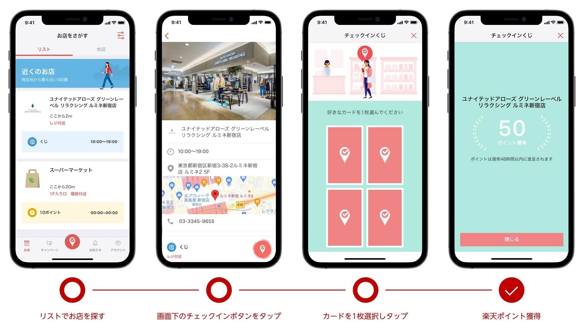 これにより、利用者は店内の指定エリアで「楽天チェック」アプリを起動しチェックインすると、くじ形式で「楽天ポイント」を最大100ポイント獲得することができるようになります。