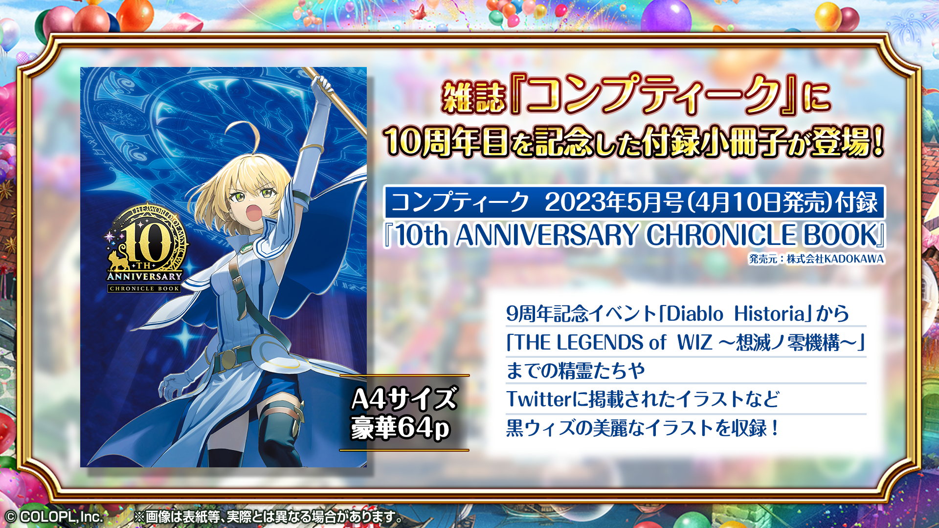 雑誌「コンプティーク 2023年5月号」にて、『黒猫のウィズ』10周年を記念した付録小冊子「10th ANNIVERSARY CHRONICLE BOOK」が登場。A4サイズ・64pと大ボリュームの豪華冊子となっています。