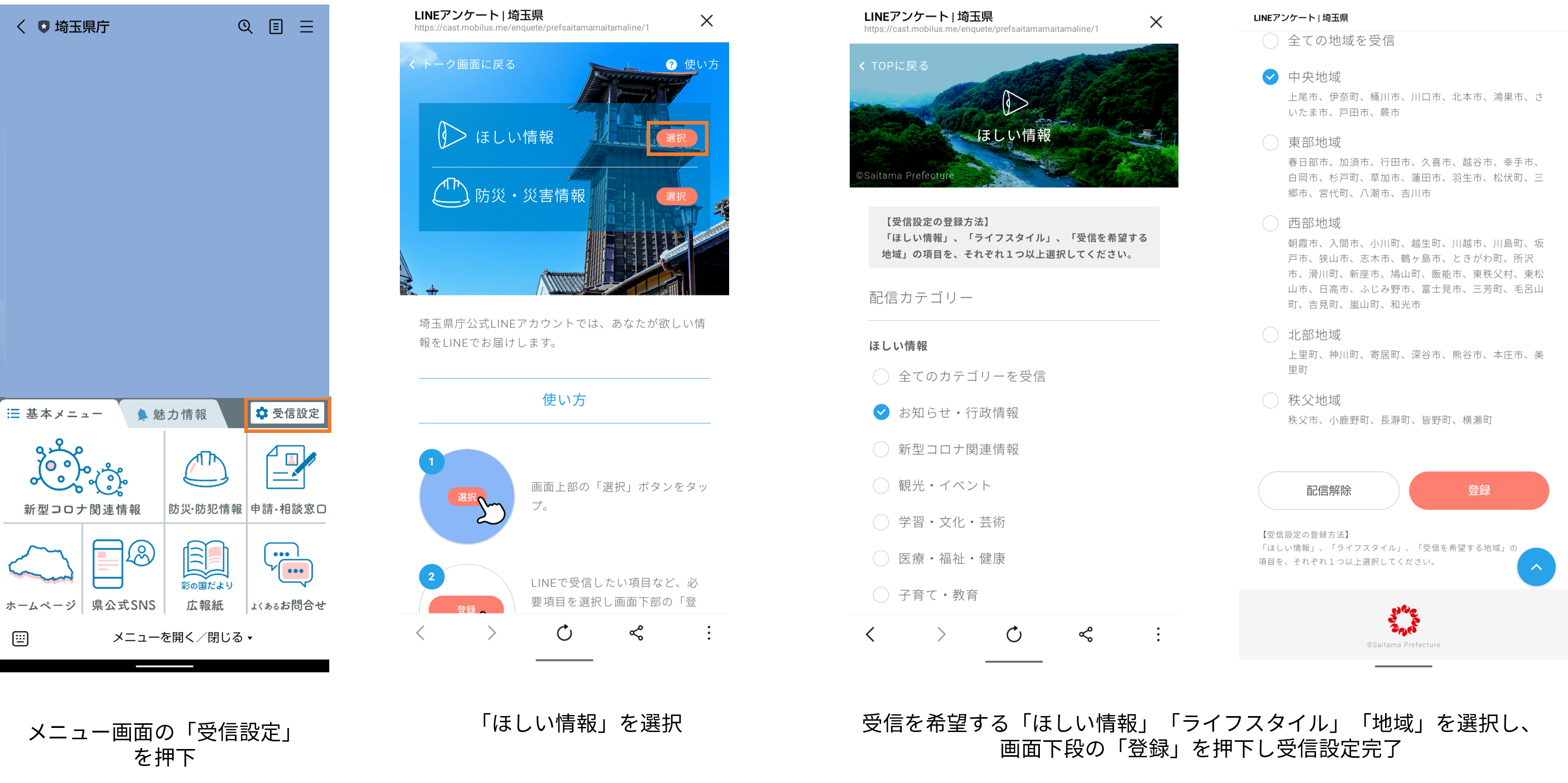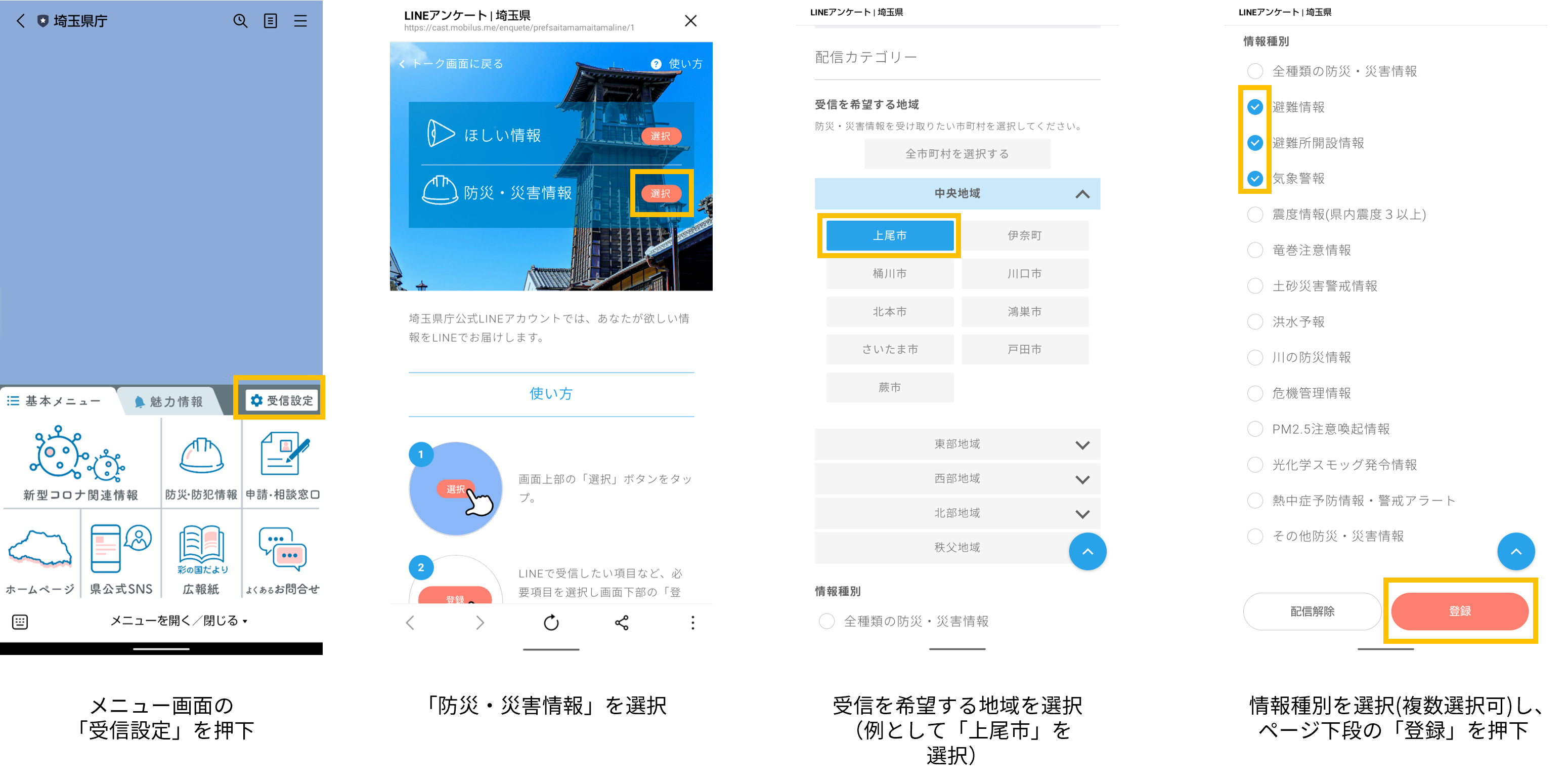 埼玉県は「防災情報」および非常時の「緊急情報・避難情報・警報」等の発信を県公式アプリ「まいたま防災」を通じて行ってきましたが、この度のLINE公式アカウントリニューアルで、これらの防災関連情報を配信する機能を埼玉県LINE公式アカウントに追加しました。これにより、埼玉県LINE公式アカウントと友だちになった利用者は希望する防災・災害情報を選択して受信できるようになります。埼玉県内の「受信を希望する地域」と、13項目の「情報種別」から選択することができ、利用者自身が必要とする情報を選んでLINE上で受信することが可能です。