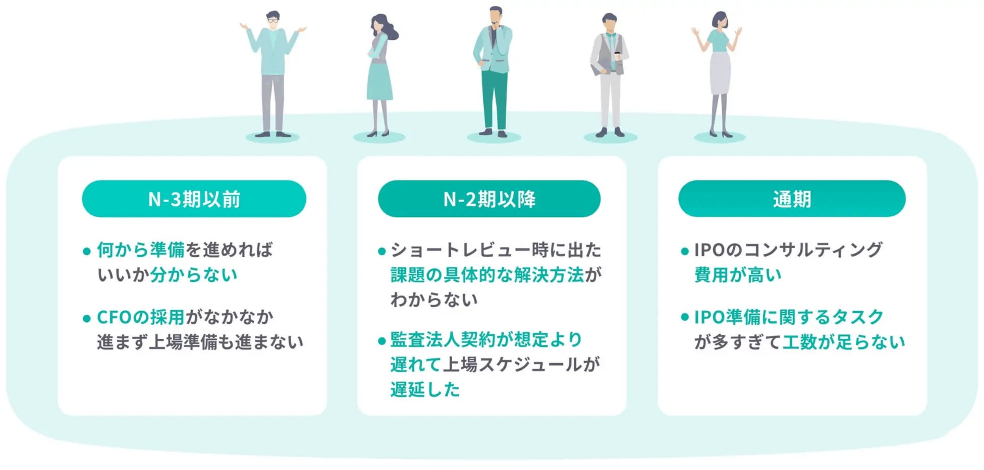 中でも、上場までにかかるIPOコンサル費用が高額(些細なことでもコンサルに指示を仰いでしまう)、IPO準備に関するタスクが多すぎて工数が足らない(おおよそ600近いタスクが存在)、CEOがIPO準備に時間を取られて事業や経営に集中できない。
