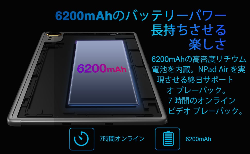 【大容量ストレージ+長寿命】4GBのRAM(メモリー)と64GBのROM(高速ストレージ)を搭載し、MicroSDカードによる拡張ストレージに対応。タブレットの大容量ストレージにより、Webサイトやビデオをスムーズに視聴し、頑丈なアプリや高品質のゲームを楽しむことができます。また、最大6600mAhの大容量バッテリーで最大6時間の連続再生が可能です。NPad Airは、最大1TBの容量のTFカードもサポートし、より多くのニーズを満たすためにストレージスペースを拡張します。