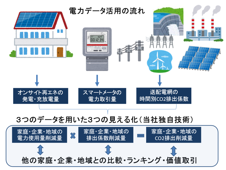当社の技術を用いて、1.スマートメータによる電力取引量に加え、2.オンサイト再エネの充放電量、3.送配電網の時間帯別排出係数の3つのビッグデータを用いて、(1): 家庭や企業・地域の電力消費量(削減量)、(2): 家庭や企業・地域の排出係数(削減値)、(3): (1)と(2)のかけ合わせで表される家庭や企業・地域のCO2排出量(削減量)の3つの指標で、CO2排出削減努力を見える化し、消費と再エネ発電が相互追従する仕組みを実装いたしました。