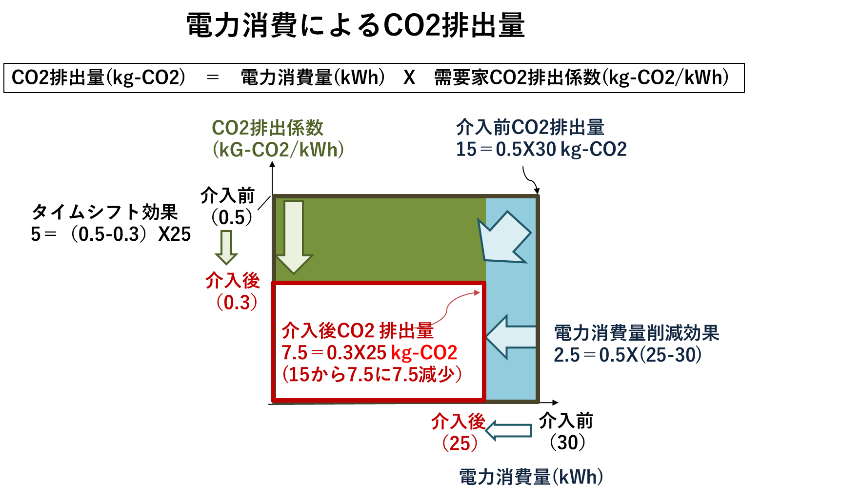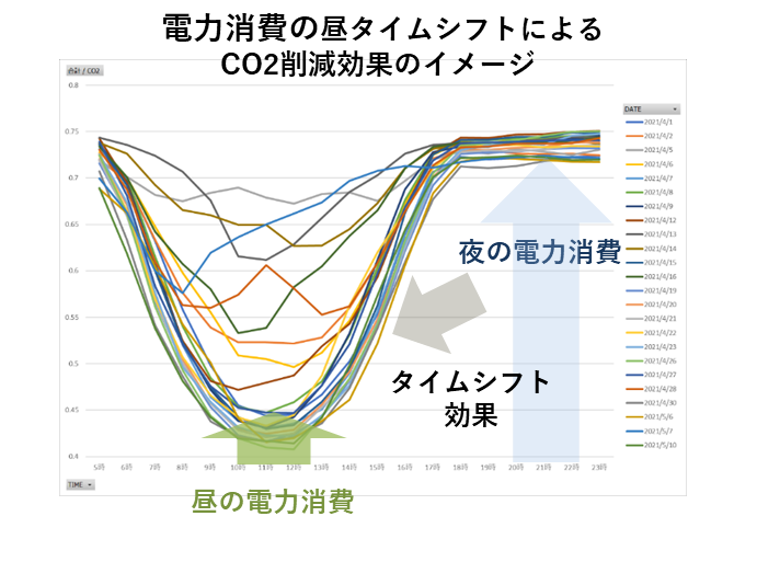 これは、自動車運転に例えれば、ガソリン消費量の削減は、走行距離の削減と単位走行距離当たりの燃費の向上の両面でもたらされるものであることを可視化し、エコドライブ推進が国民の意識に定着化していることに似ています。電気においても、「再エネ比率の高い昼間に電力消費をタイムシフトしよう」という機運を醸成すべきと考えます。