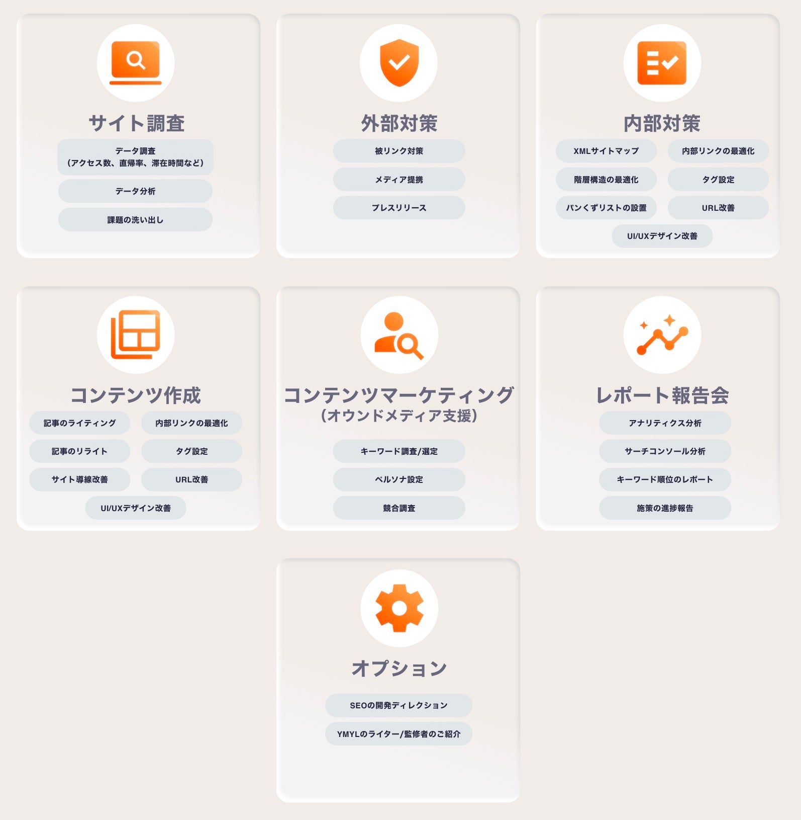 サイト調査や外部対策、内部対策、コンテンツ作成、コンテンツマーケティング、レポート報告会など、SEO対策におけるコンサルティングから運用代行まで、幅広いサービスを提供しています。