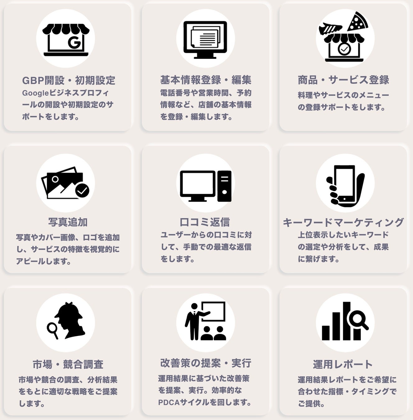 Googleビジネスプロフィールの開設や初期設定や商品・サービス登録、写真追加、キーワードマーケティング、運用レポートなど、コンサルティングから運用代行まで、幅広いサービスを提供しています。