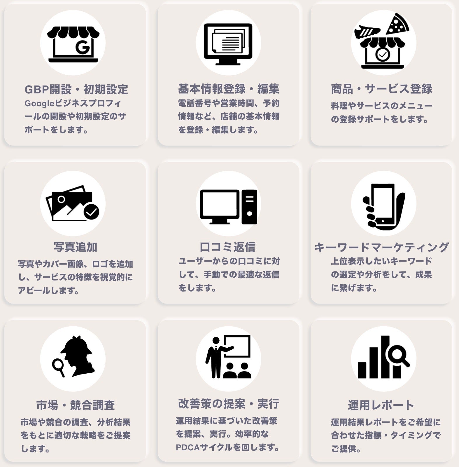 Googleビジネスプロフィールの開設や初期設定や商品・サービス登録、写真追加、キーワードマーケティング、運用レポートなど、コンサルティングから運用代行まで、幅広いサービスを提供しています。