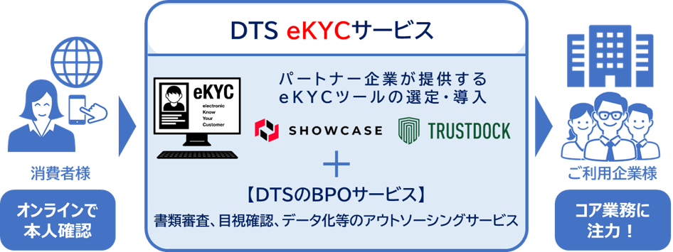 DTSのeKYCサービスはツール選定・導入支援から、目視確認作業・書類審査・データ化等のバックオフィス業務のアウトソーシングまでをワンストップでトータルサポートします。また、お客さまの事務処理の負荷軽減やペーパーレス化を実現し、コスト削減に繋げることができます。株式会社ショーケース・株式会社TRUSTDOCKのサービスを活用したお客さまに最適なソリューションをご提案いたします。