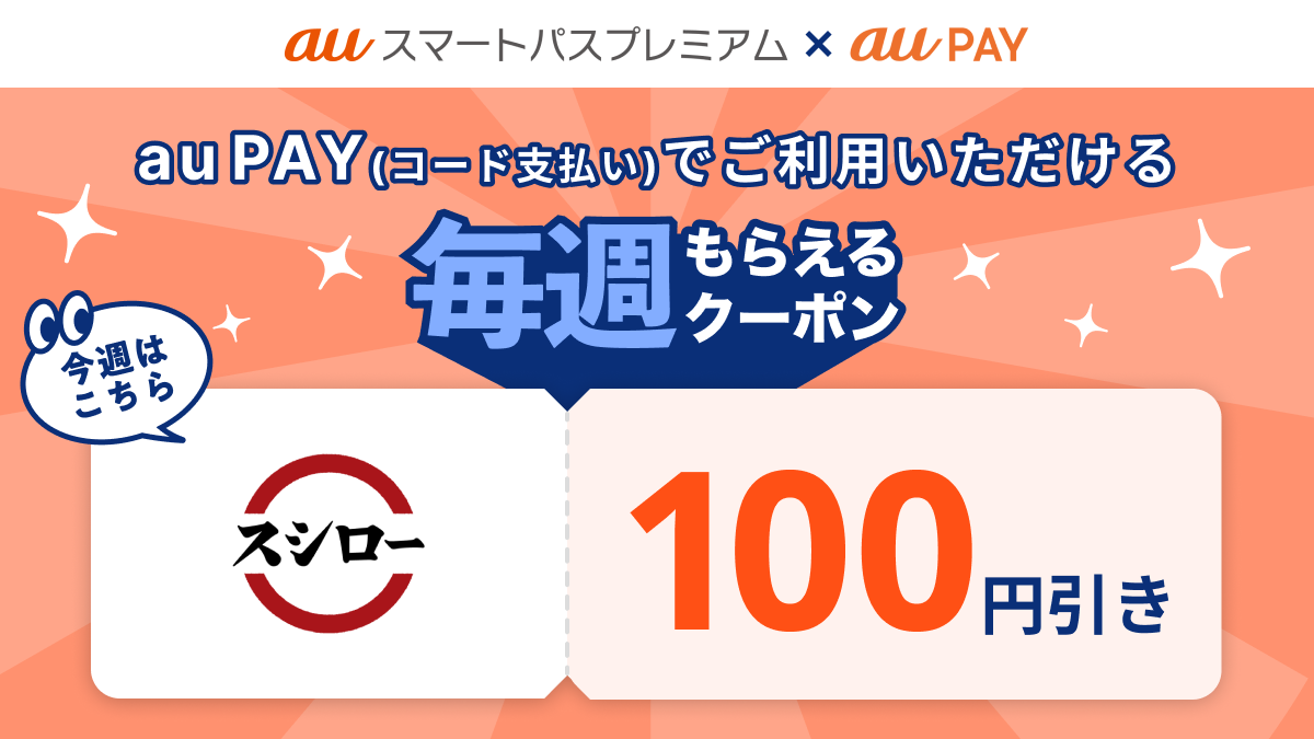 - 概要:全国のスシローにおいて、au PAYで101円以上のお支払いに使える100円割引クーポンをプレゼントします。