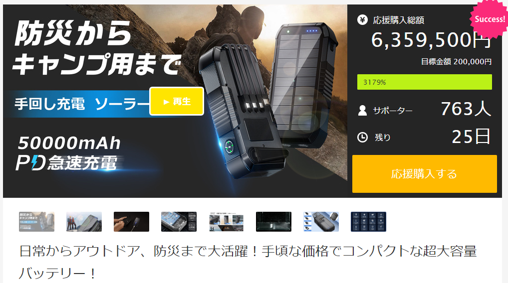 V18超大容量バッテリーとは日常利用だけでなく、災害やアウトドアでも使える最新版の超大容量バッテリーです。Makuakeでのプロジェクト開始から10日で応援総額635万円を突破、すでに763名を超える皆様よりご支援いただいております。