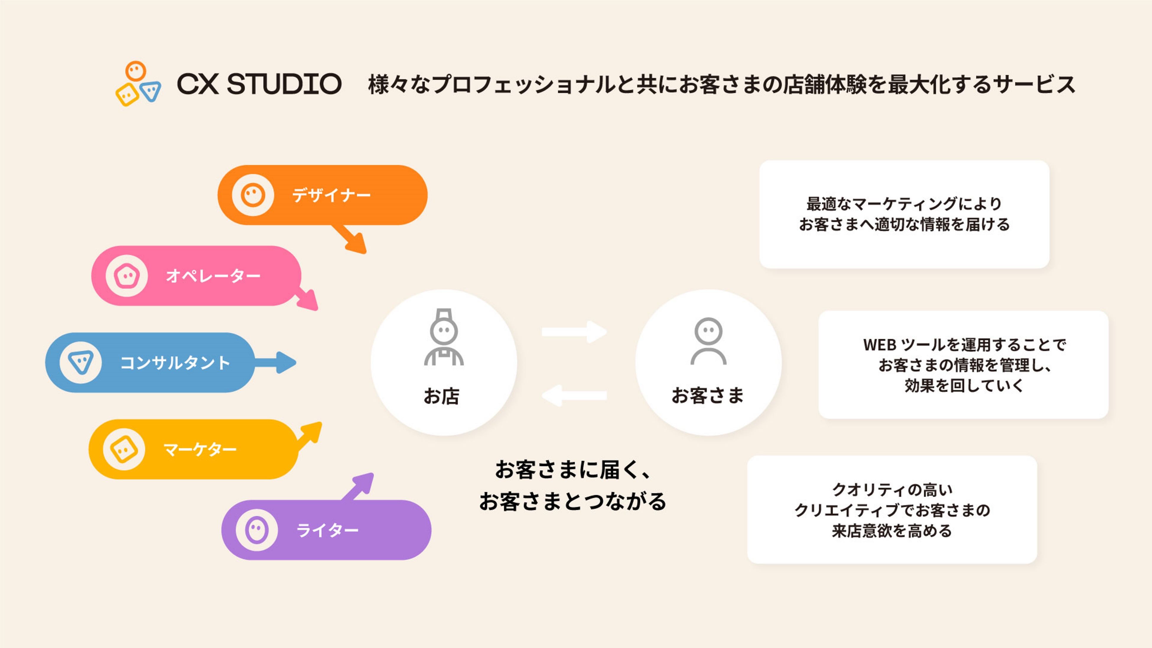 「CX STUDIO」は、飲食や美容、小売などの店舗集客のためのマーケティングソリューションとして、複数業態の飲食店を経営するファイブグループのノウハウと実績に基づいた集客コンサルティングおよび運用代行サービスを提供します。