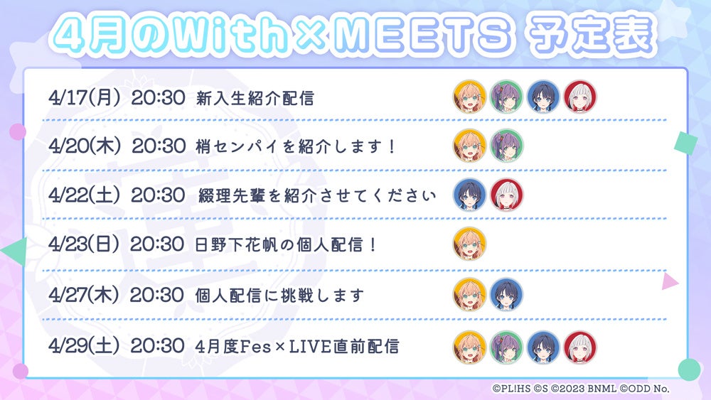 『蓮ノ空女学院スクールアイドルクラブ』は「Link!Like!ラブライブ!」の中で定期的な生配信「With×MEETS」やバーチャル音楽ライブ「Fes×LIVE」を開催してまいります。2023年4月の主な活動予定は以下の通りです。