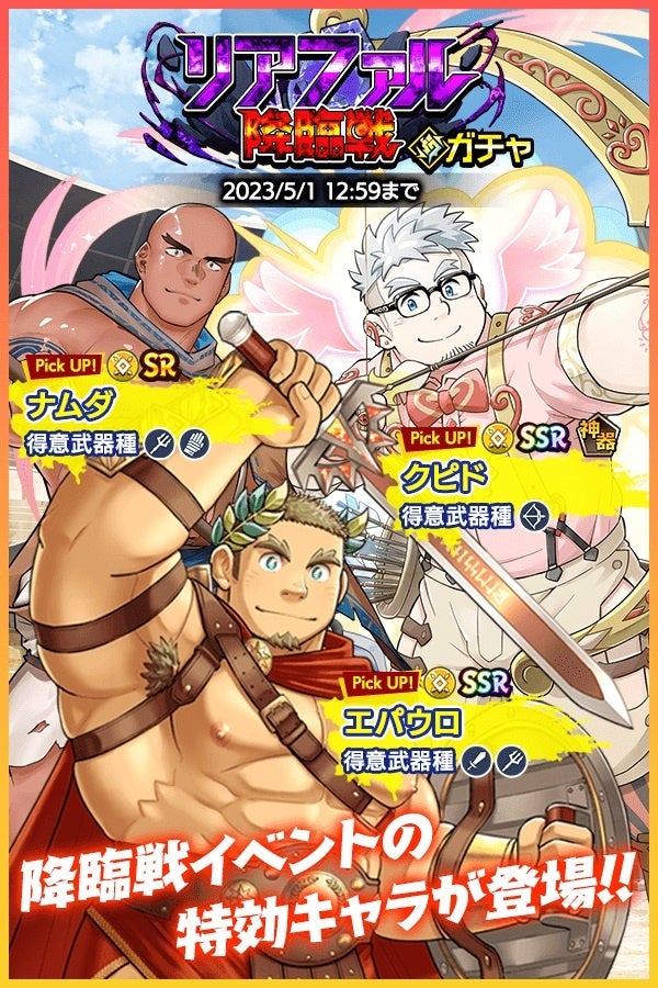 SR魂友「ナムダ」とSSR魂友「エパウロ」、SSR神器「クピド」が入手しやすい「リアファル降臨戦ガチャ」をお見逃しなく。