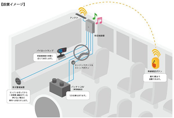 無線式であるため、取付箇所の制約がありません。高い位置に設置することで、園児の押し間違い防止にも対応できます。また、園児が押し間違えた場合も、エンジン駆動中は反応しないため、機器の使用に問題はありません。