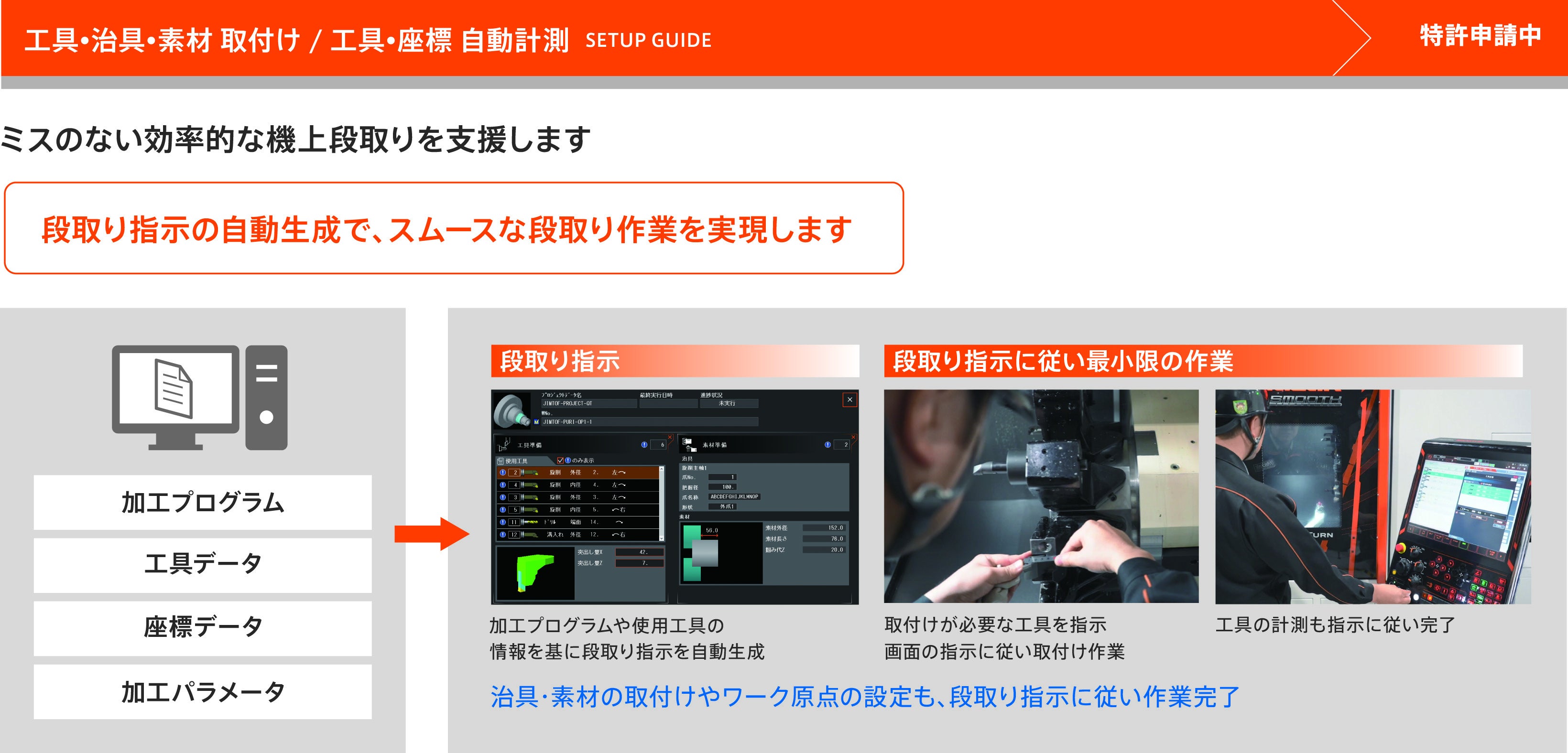 「MAZATROL DX」から工場の実機へ加工に必要なデータを転送します。その情報をもとに、機上での工具取付や工具の突き出し量などの段取り指示を自動で生成します。現場オペレータはNC装置のモニタ上の指示に従い、治具やワークなどの取付けを行うことで、簡単に段取り作業ができます。誰でも正確に段取り作業を行えるため、作業者のスキルのばらつきによるミスの発生を抑制します。