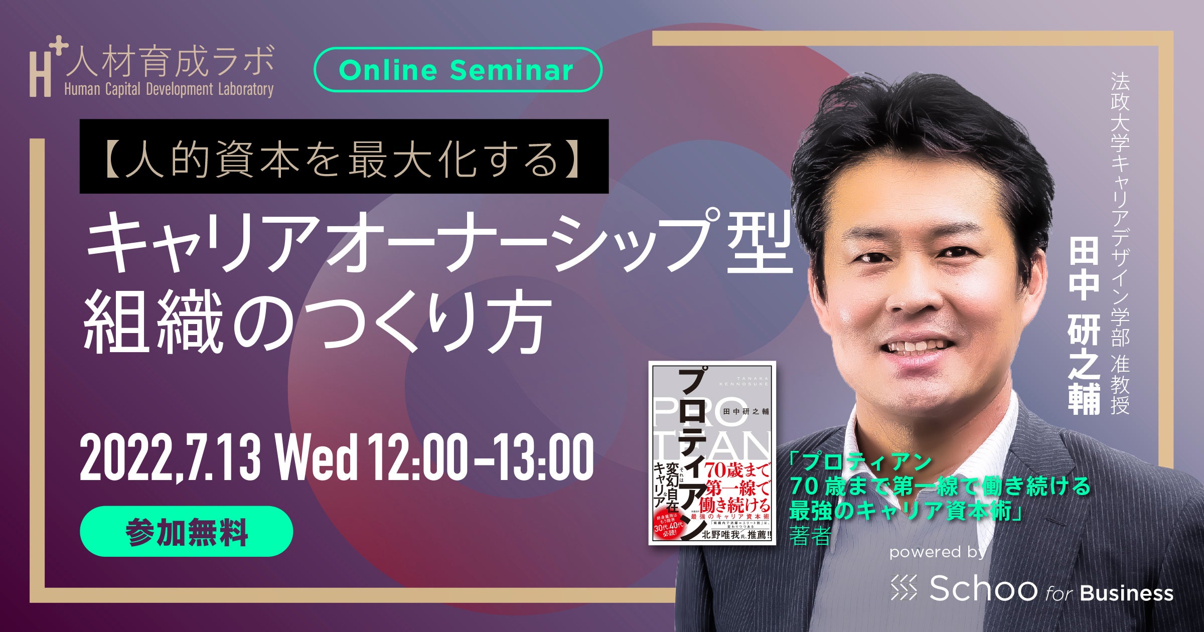 本セミナーでは、法政大学 キャリアデザイン学部 教授 田中 研之輔 氏をお招きし、人的資本を最大化するためのキャリアオーナーシップ型組織の作り方についてお話いただきます。