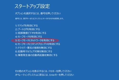 Step6:パソコンの再起動が完了すると次の画面が表示されますのでキーボードの「5」を押してセーフモードに切り替えます。パソコンを再起動するとセーフモードから通常モードに戻ります。