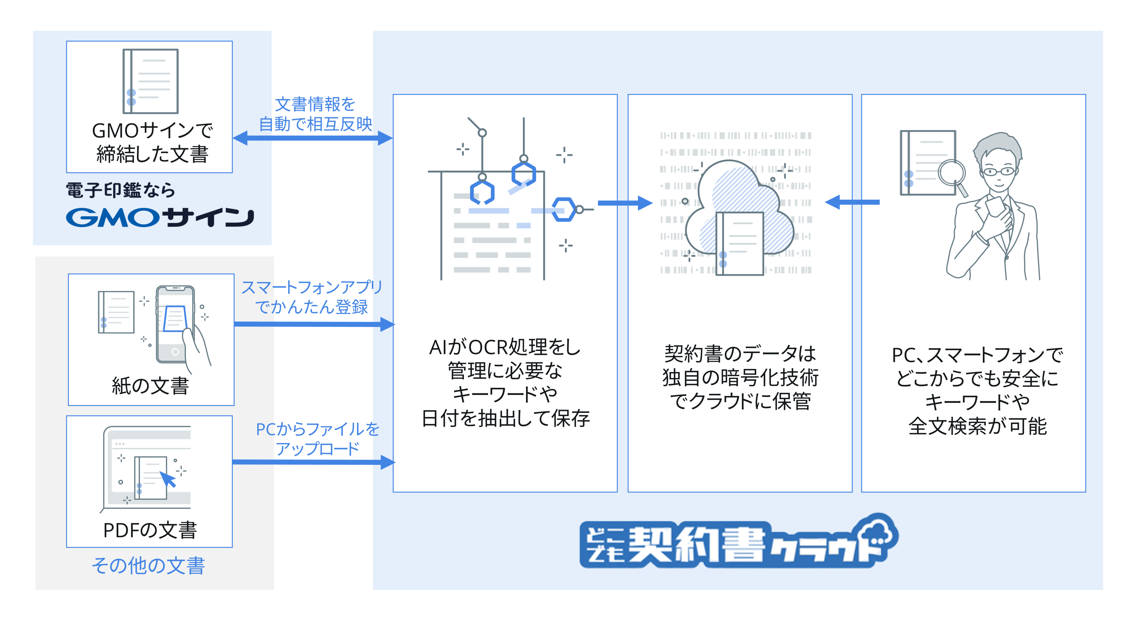 連携を行うことにより契約書情報を双方向でシームレスに同期することが可能になりました。これにより、電子印鑑GMOサインで締結した契約書は自動的にどこでも契約書クラウドに保管され、どこでも契約書クラウド上で編集や変更をされた契約情報は電子印鑑GMOサイン上においても自動更新が行われます。また、スマートフォンアプリでスキャンした紙の契約書や、PCからアップロードしたPDFの契約書もどこでも契約書クラウド上に保管されているため、紙の契約書も電子の契約書も、PC・スマホ・タブレットなどで手軽に確認することができます。そのため、リモート環境下においても独自の暗号化技術によって暗号化したまま契約書内容の検索や締結日の確認、契約先の確認をいつでもどこでも安全に行うことが可能です。