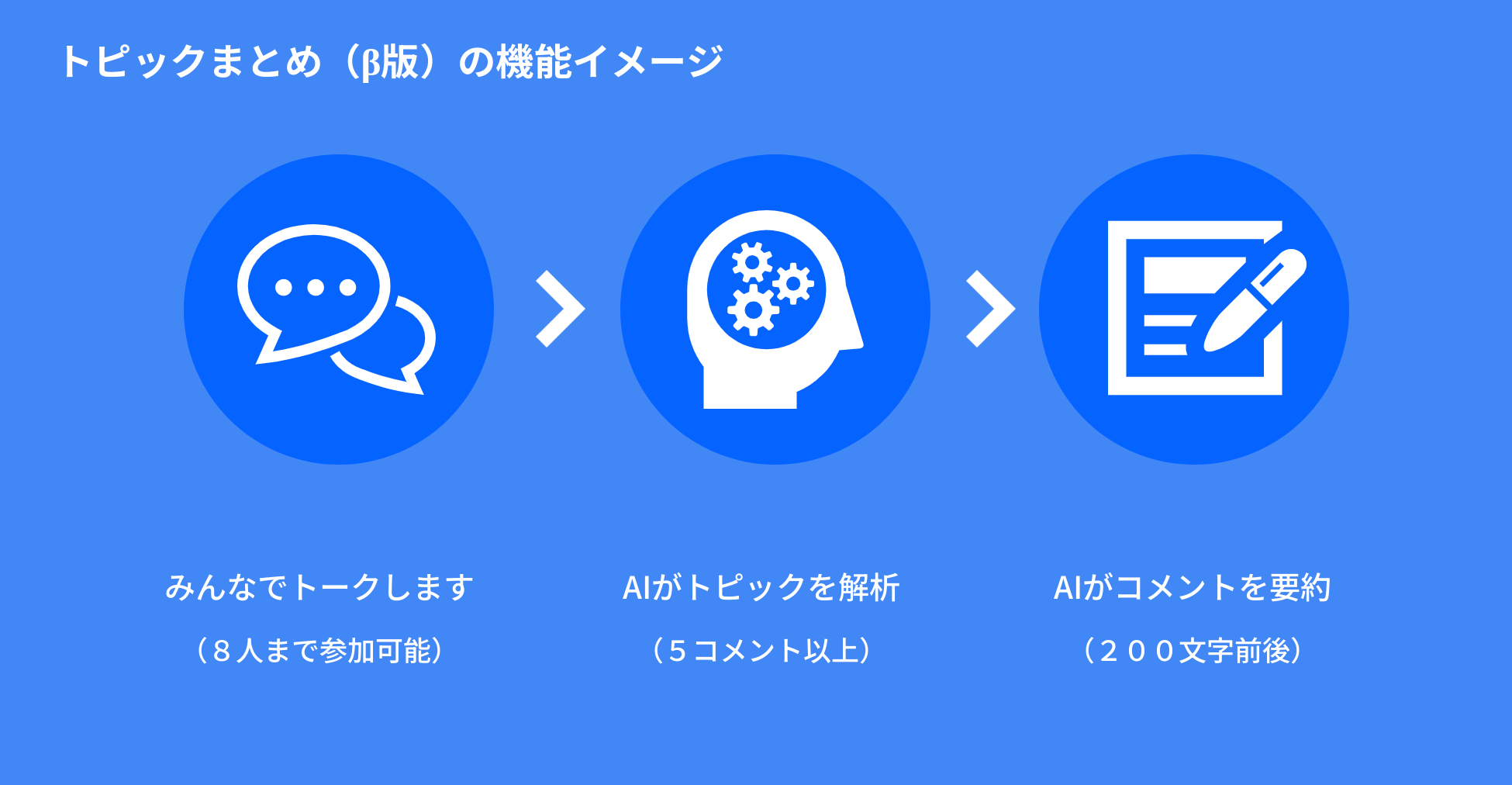 今後はみんなでコメントやアイデアなどをコメントするだけで、トピックまとめ(β版)機能がトピック内のコメントをまとめて要約コメントを投稿してくれます。利用シーンとしては、従来からのあるトピックについてのトークや時事ネタなどをみんなでトークし、最後にトピックまとめ(β版)のAIが自動でまとめてくれるので、トークされた内容をみんなで振り返ることができるようになります。