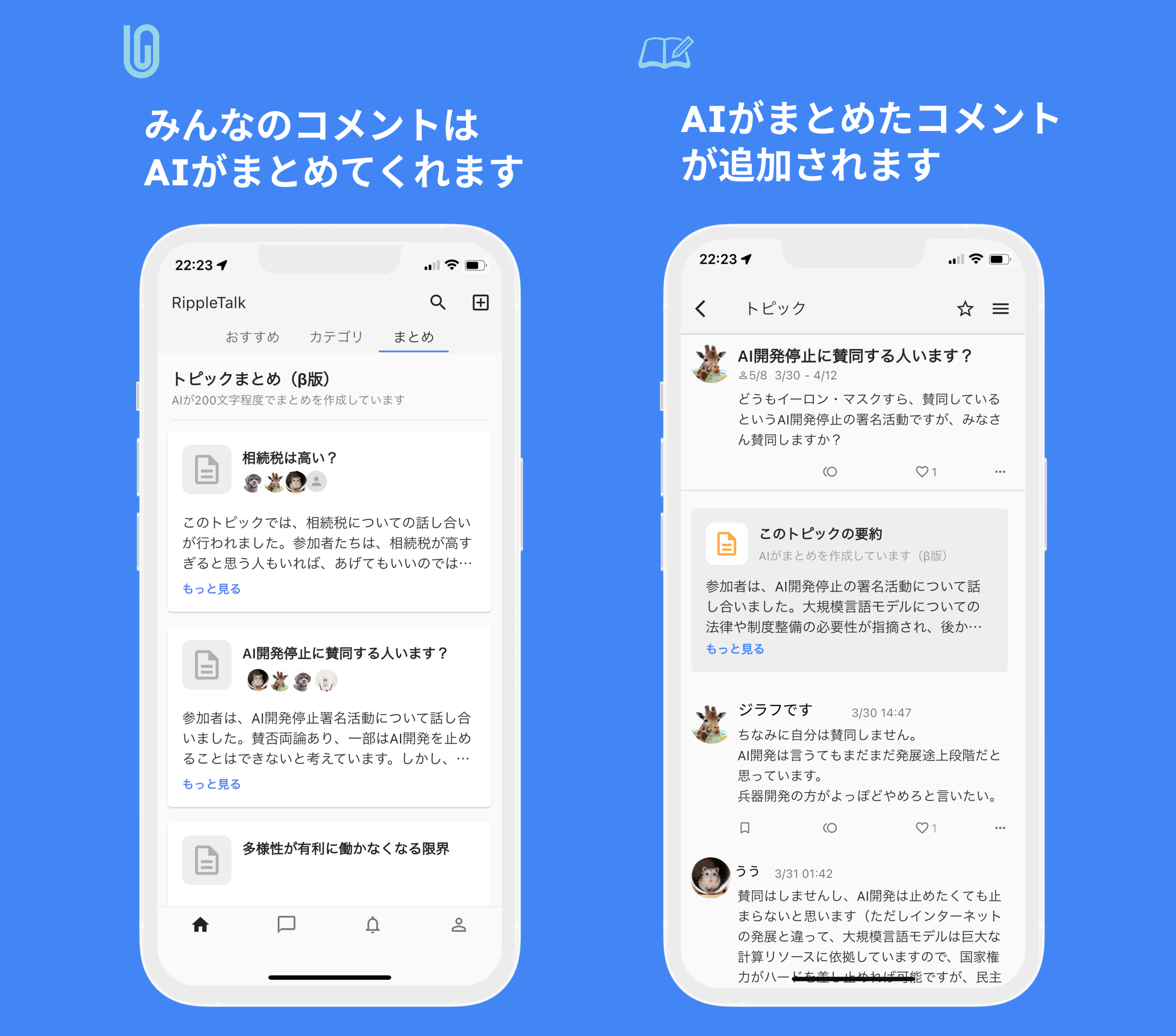 リップルトークでは、トピック毎にみんなのコメントが200文字程度にまとめられます。