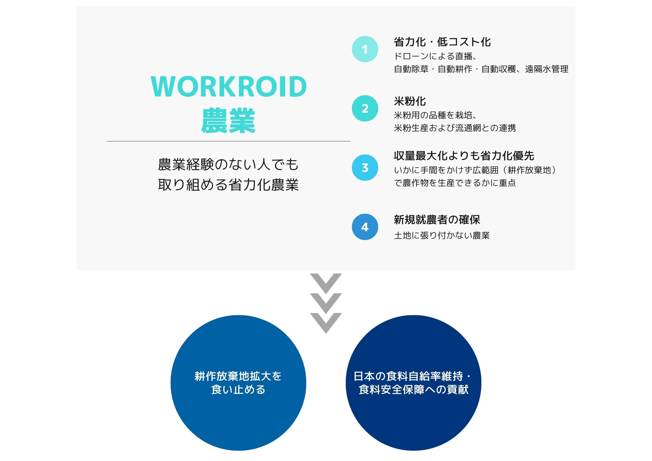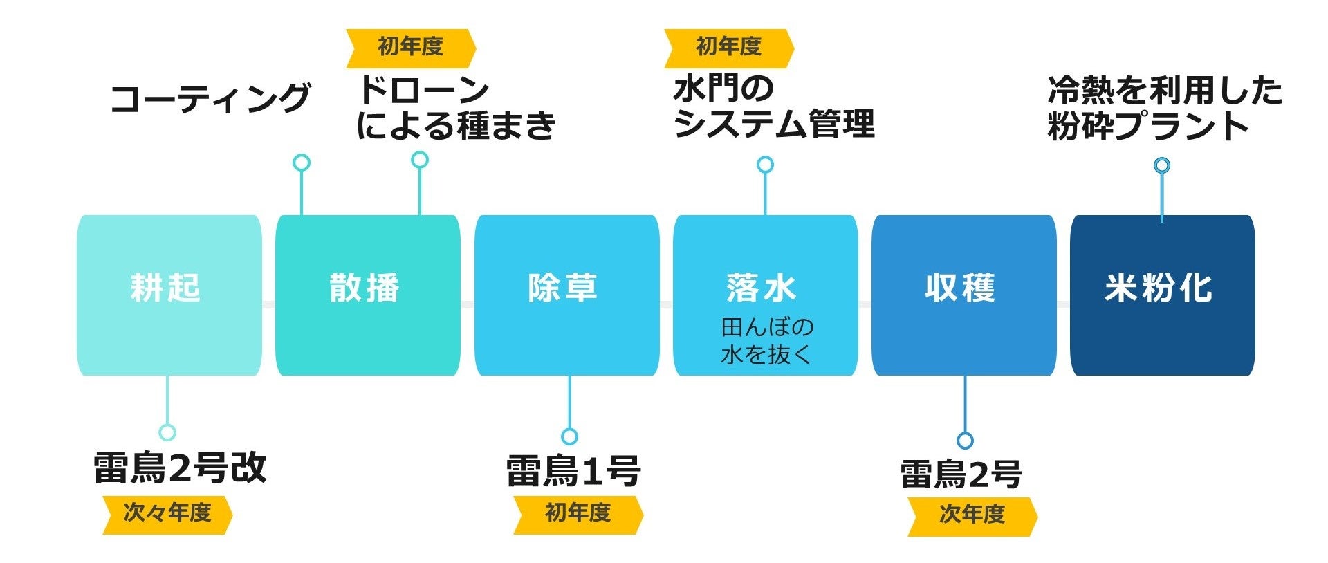 本拠点では、米粉製造に向けた水稲直播栽培(具体的には、ドローンによる直播、農業ワークロイドを使った耕作・除草・収穫等、水門遠隔管理システム等)に取り組みます。今よりはるかに少ない労力でできる稲作を実現することで、耕作放棄地拡大を食い止めること、食料自給率の維持・食料安全保障への貢献も目指します。