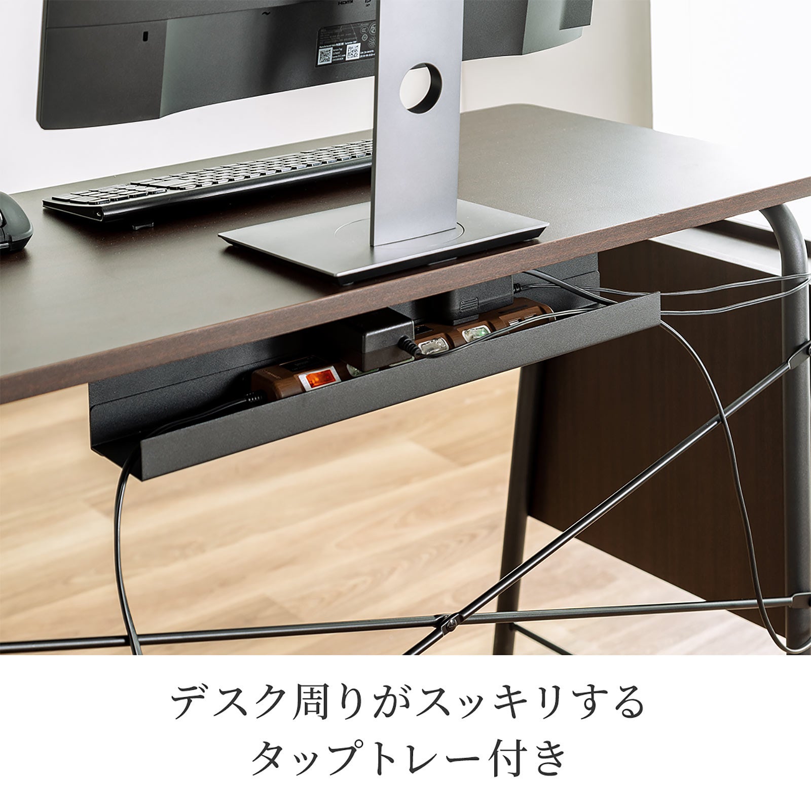 本製品は、やさしい丸みのあるフレームを装備した、幅90cm、奥行き45cmのコンパクトなパソコンデスクです。