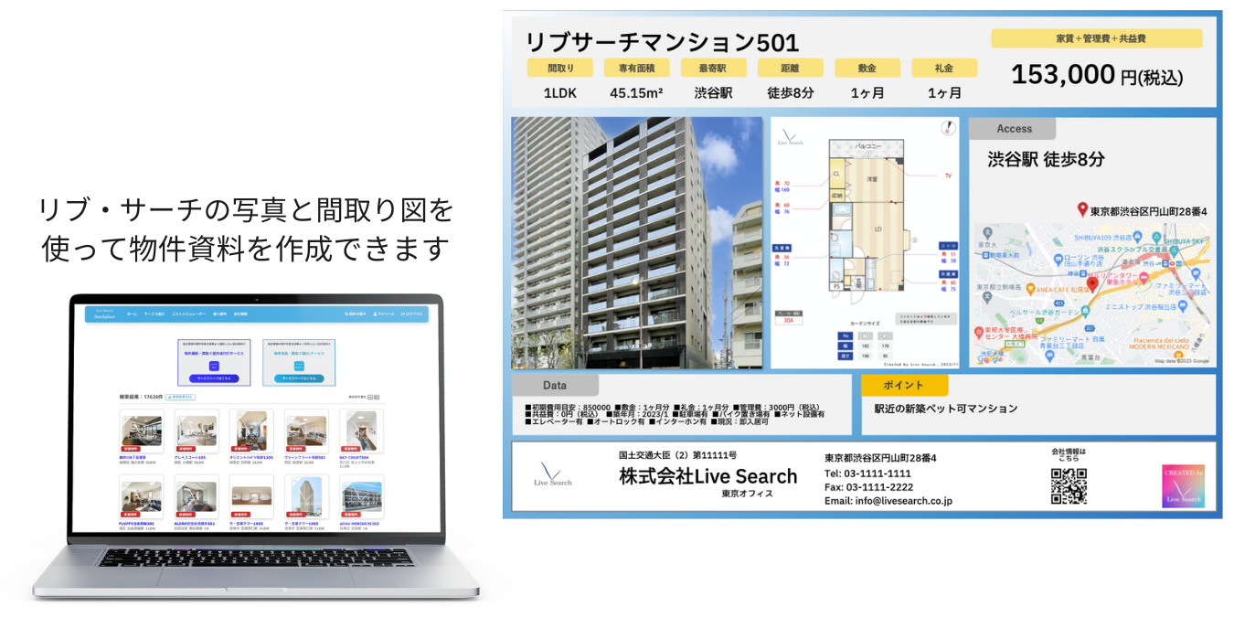 不動産会社では、物件情報の共有や宣伝のために「物件資料」を使用するシーンが多くあります。例えば、・来客への物件紹介時、・店舗への興味を惹くための店頭広告、・業者間での空室情報の共有、などが主なシーンです。これらの物件資料は各不動産会社が空室毎に作成しており、その作成も不動産会社スタッフの業務の一部となっています。リブ・サーチではその業務をもっと効率的に、かつ実用的な資料を作成できるためのツールを開発しました。この機能はリブ・サーチにて提供している以下のいずれかのサービスをご契約中の企業様なら追加料金なしで無料ツールとしてお使いいただけます。