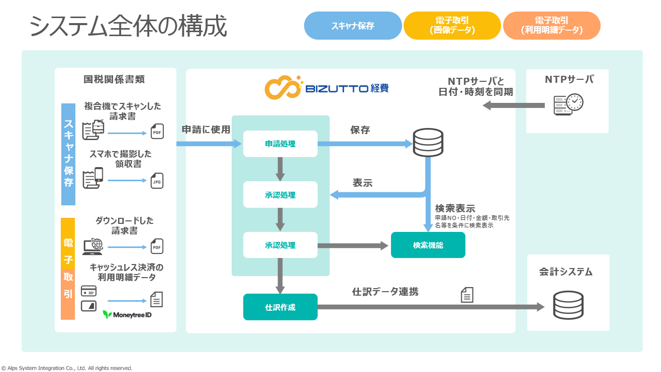 令和4年1月1日施行の電帳法に対しては、スキャナ保存と電子取引に対応しており、データ化された領収書や請求書をクラウドサーバに保存します。