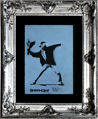 本美術館で展示している「Love Is In The Air(花束を投げる暴徒)」は、イギリスのマンチェスター市立美術館で10年以上にわたって公開展示されていた重要作品で、バンクシー自身によって木製の板にスプレーペイントされた世界に1点しか存在しない作品です。「Love Is In The Air」といえば、パレスチナ・ベツレヘムに制作された巨大壁画が有名ですが、本作品はこの巨大壁画よりも制作年代が早く、花束を投げるテロリストのモチーフの起源となる最初期の作品とされています。