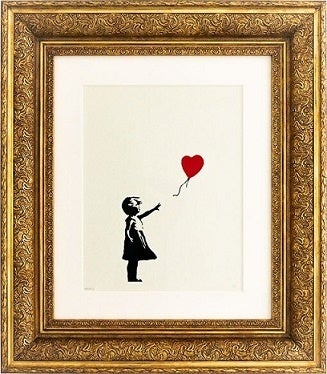 本美術館で展示している「Girl with Balloon(風船と少女)」は2004年に制作された150点のうちのひとつで、関係者への販売時のみ入れられるハートマーク付きのサインが作品左下に施されている、大変希少性の高い作品と言われています。額装は、2018年に「サザビーズロンドン」で開かれたオークションにおけるシュレッダー事件の額装を忠実に再現しています。
