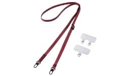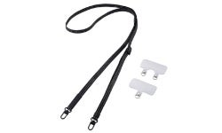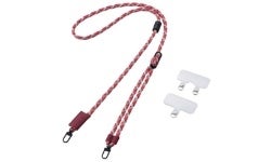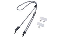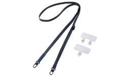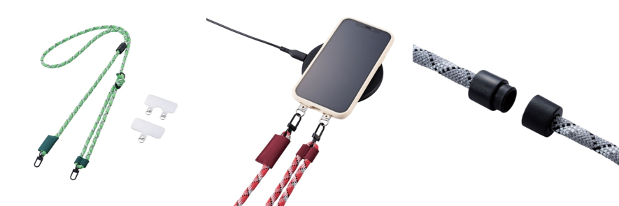 ■反射板や安全パーツが付いた、肩から掛けられる丸紐タイプのスマホショルダーストラップです。