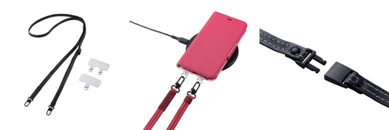 ■お持ちのケースにストラップホールがなくても、付属のストラップホールシートをスマートフォンとケースの間に挟むだけで使用でき、取り外しも簡単です。