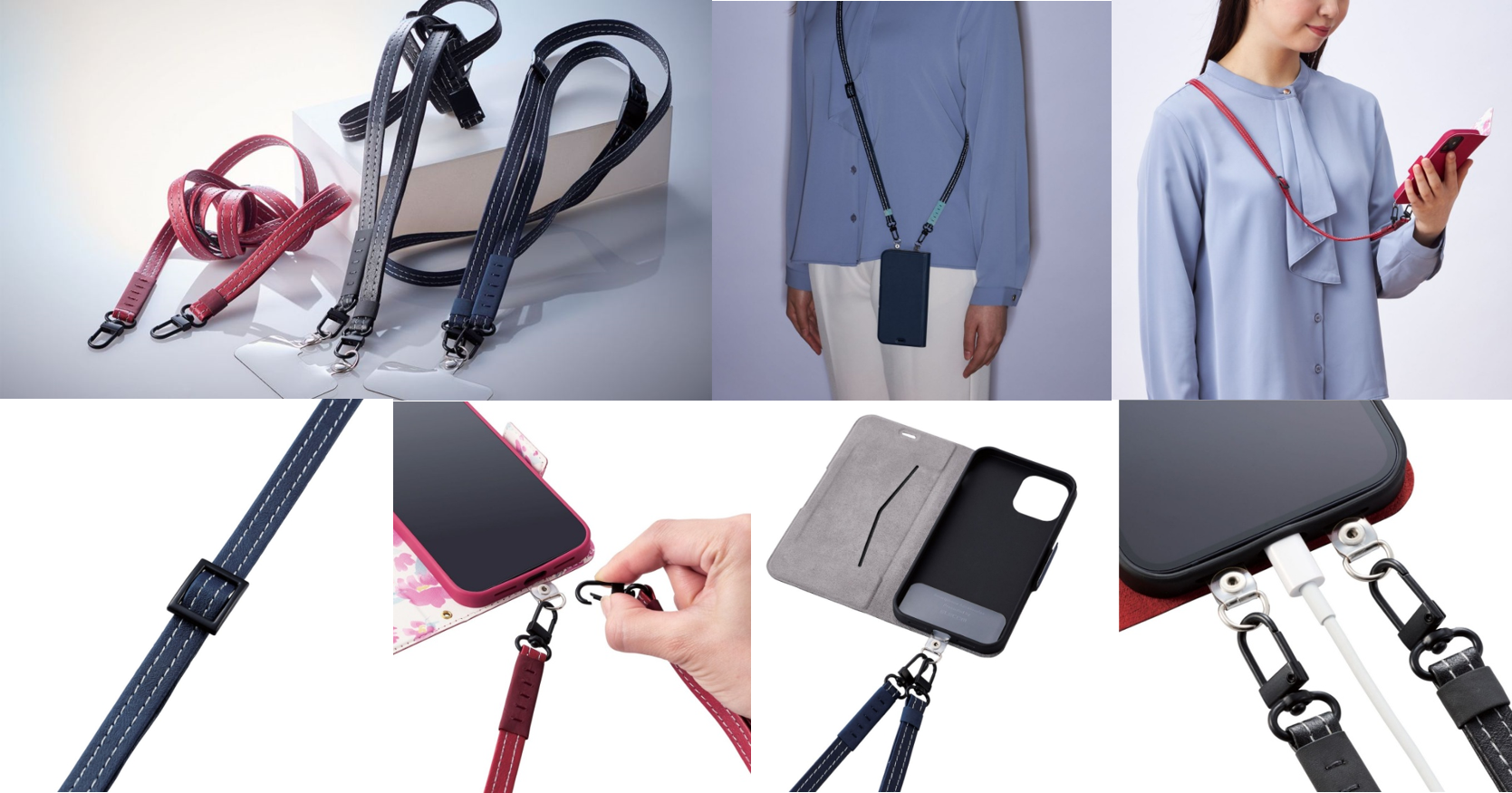 ■反射板や安全パーツが付いた、肩から掛けられるレザータイプのスマホショルダーストラップです。