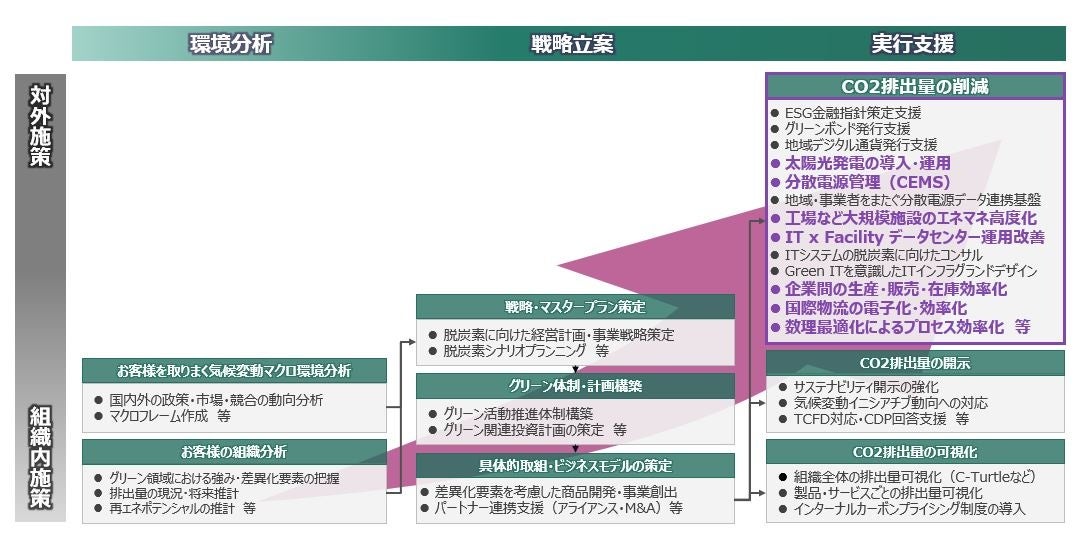 さらに、グリーンコンサルティングサービスの一環として提供することで、脱炭素戦略の策定、CO2排出量の可視化、情報開示の支援、CO2排出量を削減する仕組みづくりまで、お客様をワンストップで支援します。