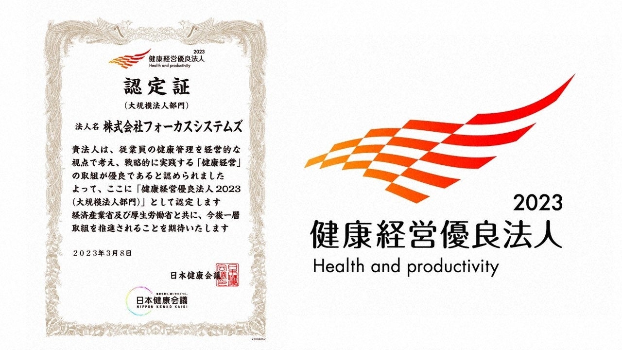 株式会社フォーカスシステムズ(東京都品川区、代表取締役社長:森啓一、以下「当社」)は、経済産業省と日本健康会議が実施する健康経営優良法人認定制度において、「健康経営優良法人2023(大規模法人部門)」に認定されましたのでお知らせします。