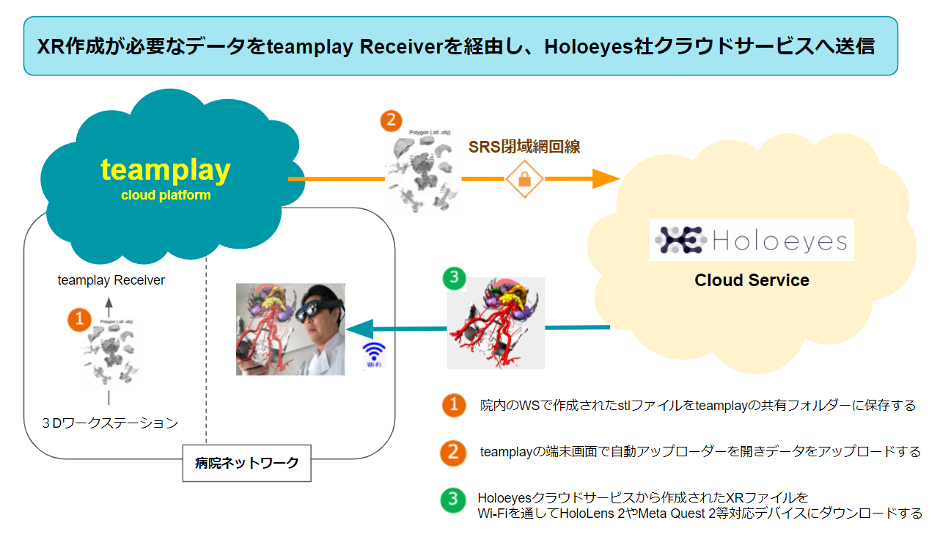 医療機関では、今までHoloeyesのサービス利用する際にはWi-Fiなどを利用し、Holoeyesのクラウドサービスへデータをアップロードしていました。シーメンス社のteamplayと連携をすることにより、teamplayが導入されているPCから、院内ネットワークを通じてHoloeyesのクラウドサービスへデータをアップロードすることが可能です。