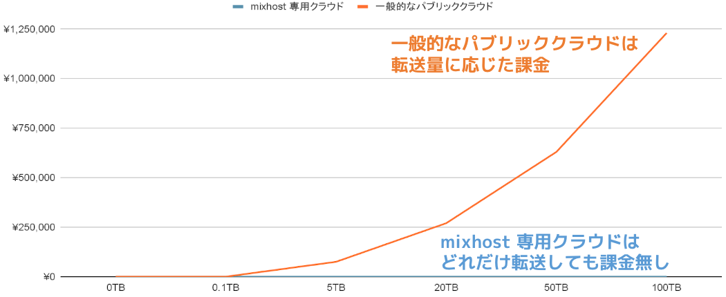 AWSをはじめとする一般的なパブリッククラウドは、転送量課金が従量制となっており、多くの転送を行うと利用料金が高額になる場合があります。