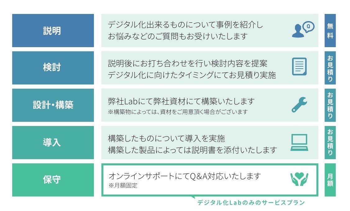 ProVisionは、これまでもRPA導入支援サービスや、学校施設向けのキッティングサービスなどを通して、デジタル化(DX)に向けた課題解決に取り組んでまいりました。この度は、DXを推進したいが知見がない、必要なIT人材が確保できない、予算が限られていてなかなか着手できない、などのお悩みを抱える企業様に向けたサービスを検討した結果、「デジタル化おまかせLab」のご提供に至りました。