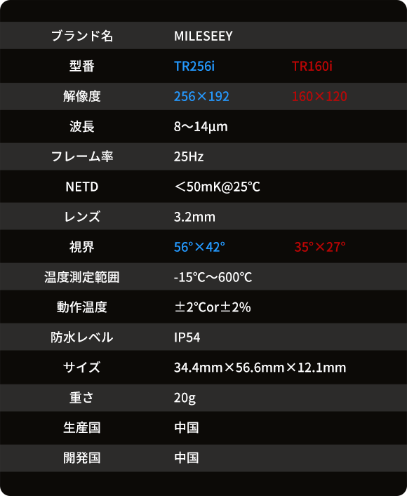 「MILESEEY TR256i&TR160i」は、対象物から出ている赤外線放射エネルギーを検出して温度変換し、温度分布をスマホの映像で表示するカメラを採用しています。