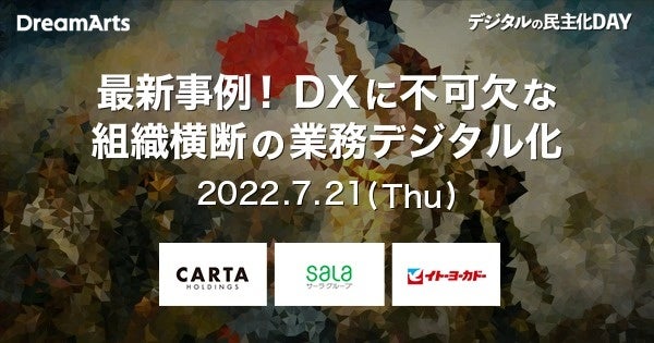 「デジタルの民主化DAY」は、過去開催において1,000名以上が参加しアンケート満足度95%を超えるなど、大変好評を博しました。 第3回となる今回の「デジタルの民主化DAY」は、「DXに不可欠な組織横断の業務デジタル化」をテーマとして、株式会社CARTA HOLDINGSと株式会社サーラビジネスソリューションズ、株式会社イトーヨーカ堂の担当者より、ドリーム・アーツの提供するクラウドサービスを活用した「デジタルの民主化」の先進的な取り組み事例をご紹介します。