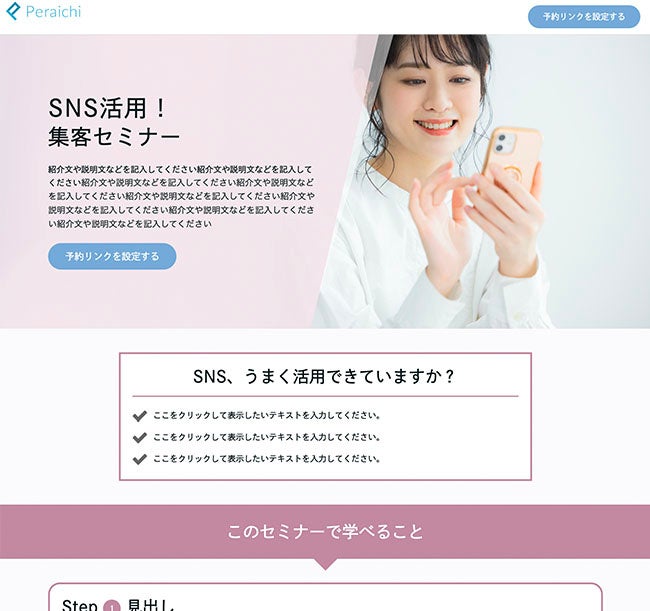 ペライチの運営するHP作成ツール『ペライチ』は、HP作成、フォーム設置、オンライン決済、ネット予約、メルマガなどビジネスに必要な機能をオールインワンで提供しています。サービスの改善、拡充に加え、日々さまざまなセミナーを開催しており、ペライチの活用方法についてはもちろん、ビジネスをする上での知見やノウハウなどを提供することで、個人事業主の方や中小企業の方のビジネスの支援をしてきました。